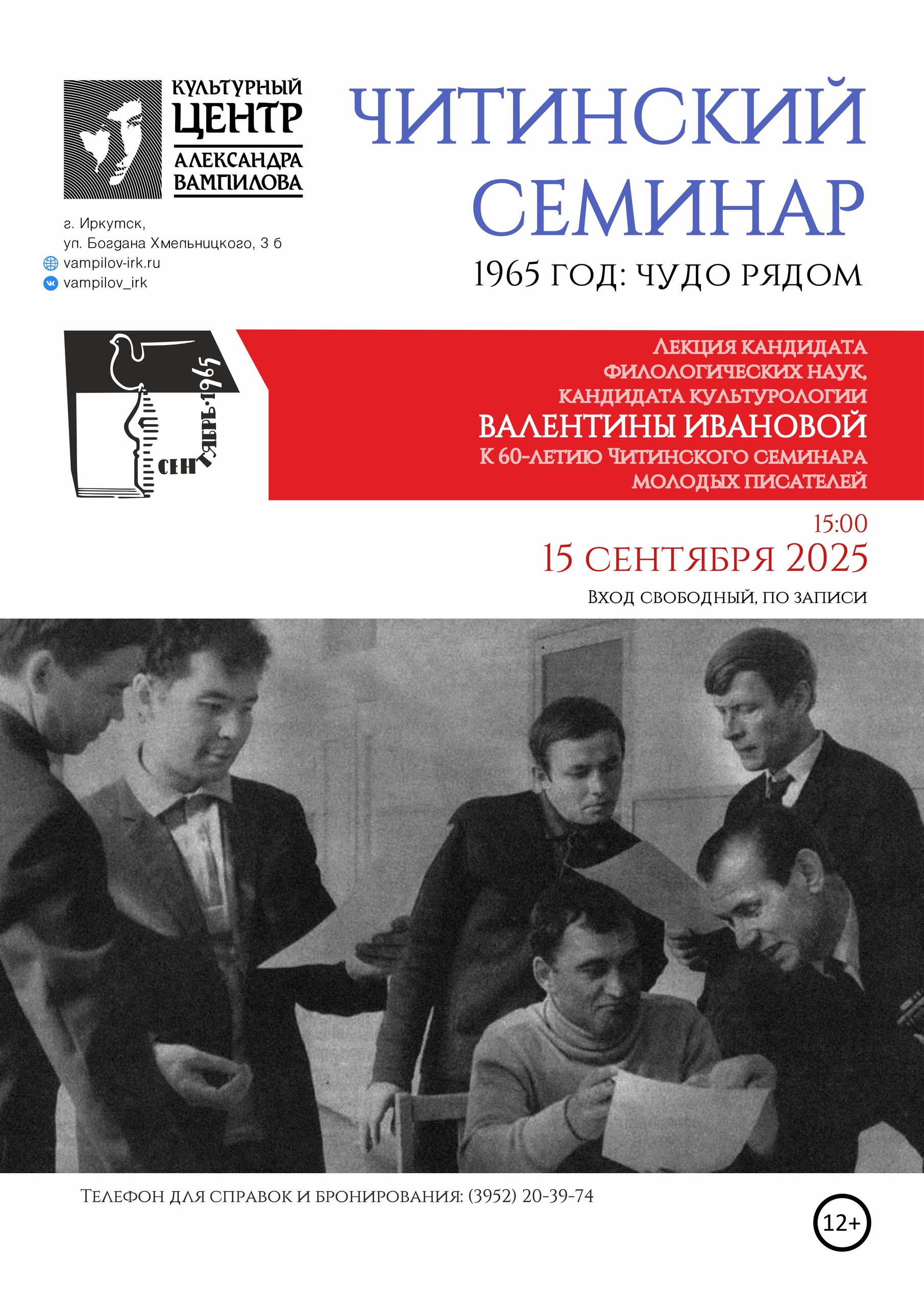 Лекция кандидата филологических наук, кандидата культурологии Валентины Ивановой, посвященная 60-летию Читинского семинара молодых писателей, состоится 15 сентября 2025 года в Культурном центре Александра Вампилова. Начало в 15:00.