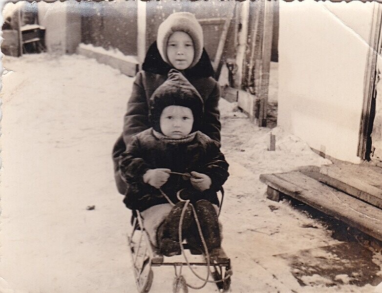 В самом центре нашего заводского поселка, недалеко от нашего дома, открылись четыре новых магазина («На 4-х углах»). Уже темно было, наверное, часов пять-шесть вечера. До сих пор помню ощущение санок под собой, скользящих по свежему снежку. Я обнимаю младшего брата, тесно прижавшегося ко мне, а впереди – папа-лошадка, молодой, красивый, улыбающийся, и искорки снега на его, очень модной тогда, серой каракулевой шапке.