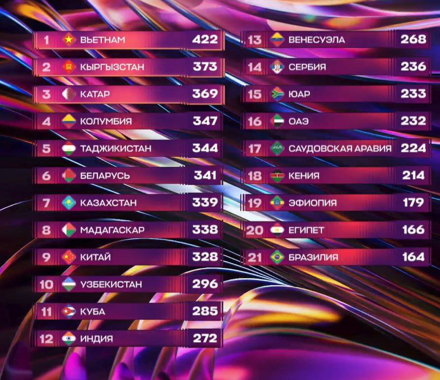 Конечно, в таких конкурсах интересны не только результаты, но и кто за кого проголосовал. Россия отдала первое место Беларуси (как и Колумбия, ОАЭ и Узбекистан), а Беларусь - Китаю. Чистую победу Вьетнаму отдали Катар, США, Таджикистан и Эфиопия, за Катар проголосовали Вьетнам, Индия, Сербия, за Кыргызстан - Венесуэла и Мадагаскар.