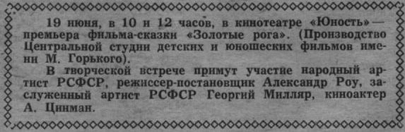 В 1969 году вышла сказка «Варвара-краса, длинная коса», а в 1972 году – фильм «Золотые рога», причем знаменитый кинорежиссер привез премьеру этого фильма в Сибирь.