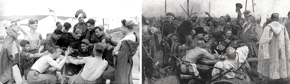 На фото: работая ежегодно осенью в колхозе, ребята выдумали делать фотокартины. По памяти они восстанавливали какую-то известную картину и воспроизводили её. Здесь изображена картина Ильи Репина «Запорожцы пишут письмо турецкому султану».
